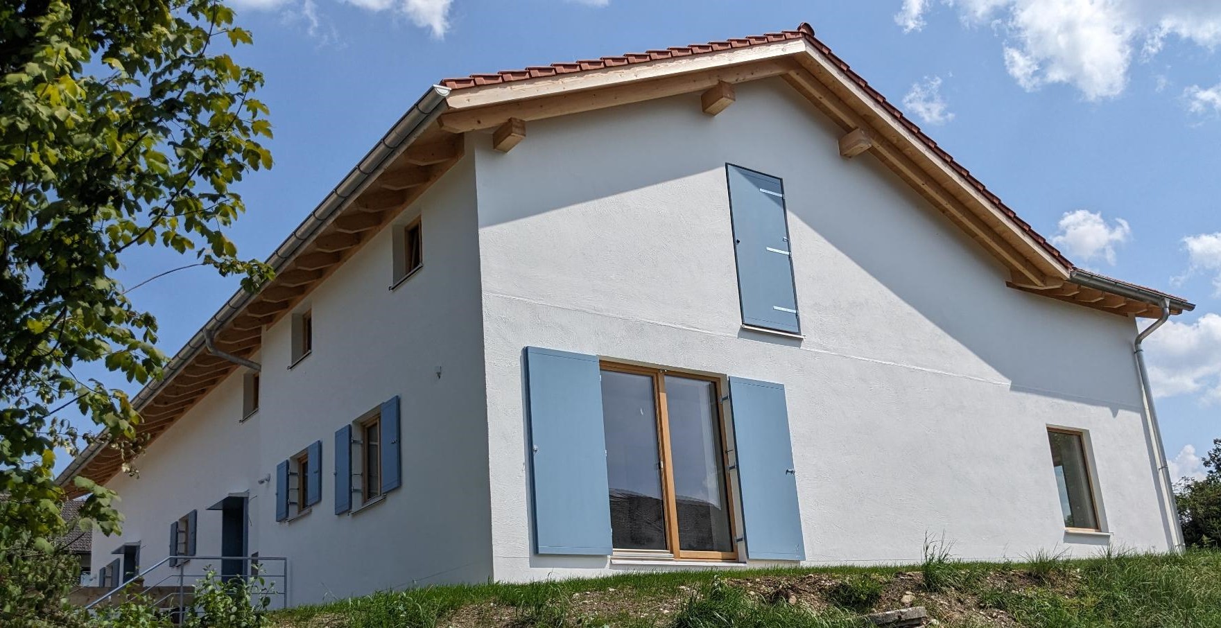 Traditionelle Bauweisen und gestalterische Elemente wie der weite Dachüberstand und die Holzfensterläden